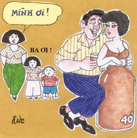 Tôi từng vẽ tranh vui châm biếm tật nhậu xỉn của mấy ông. Tranh vẽ một người đàn ông ôm chặt cô gái thật đẹp và quyến rũ hết sức như không muốn rời ra, cô gái đẹp mặc chiếc váy rộng xem kỹ lại là thân chai rượu được cách điệu, phía sau người đàn ông ôm cô gái (thực chất là chai rượu) là người đàn bà cùng hai đứa con nhỏ, người đàn bà hướng về người đàn ông gọi to với cái miệng như cười: “Mình ơi!”. Tôi đã gửi tranh này lên diễn đàn trên internet quy tụ đông đảo thầy cô, bạn bè đồng nghiệp của tôi ở nhiều nước với mục đích cho thấy phụ nữ vẫn còn nhiều đau khổ, riêng ở Việt Nam thì nỗi khổ rất nặng đè lên đôi vai yếu ớt của các chị em là phải chịu đựng ông chồng sáng say chiều xỉn.
