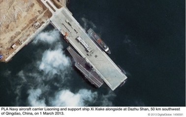 Tàu sân bay Liêu Ninh của Hải quân Trung Quốc đậu tại quân cảng ở Thanh Đảo, do công ty vệ tinh Digital Globe Mỹ chụp được và công bố ngày 1/3/2013.