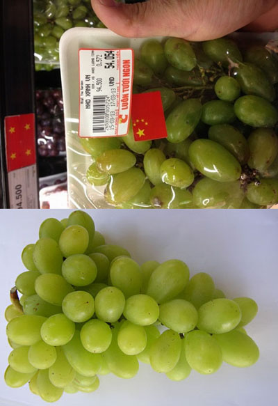 Loại nho dán cờ Trung Quốc (ảnh trên) và nho trồng tại trang trại Ba Mọi tại tỉnh Ninh Thuận (ảnh dưới)