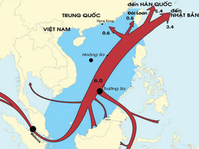 Đầu tháng 4, Cơ quan thông tin năng lượng Mỹ (EIA) vừa công bố các số liệu về vận chuyển dầu thô và khí hóa lỏng (LNG) thông qua biển Đông. Theo đó, trong năm 2011, khoảng 6.000 tỉ tcf (tương đương 169 tỉ mét khối) khí hóa lỏng được vận chuyển qua biển Đông. Con số này tương đương với một nửa tổng lượng khí hóa lỏng giao thương toàn cầu trong cùng khoảng thời gian. Tổng số 6.000 tỉ tcf LNG trên, chủ yếu được chuyển đến Hồng Kông, Đài Loan, Hàn Quốc và Nhật Bản. Trong đó, khoảng 3.400 tỉ tcf LNG có điểm đến là Nhật Bản. Ngoài ra, trong năm 2011, mỗi ngày có khoảng 11 triệu thùng dầu thô được vận chuyển thông qua biển Đông để tỏa đi Hồng Kông, Đài Loan, Hàn Quốc và Nhật Bản. |