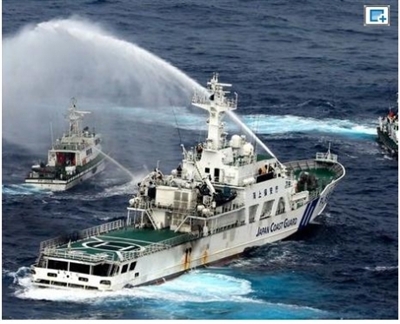 | Cảnh sát Biển Nhật Bản phun vòi rồng chặn tàu cá Trung Quốc đi vào khu vực đảo Senkaku. |