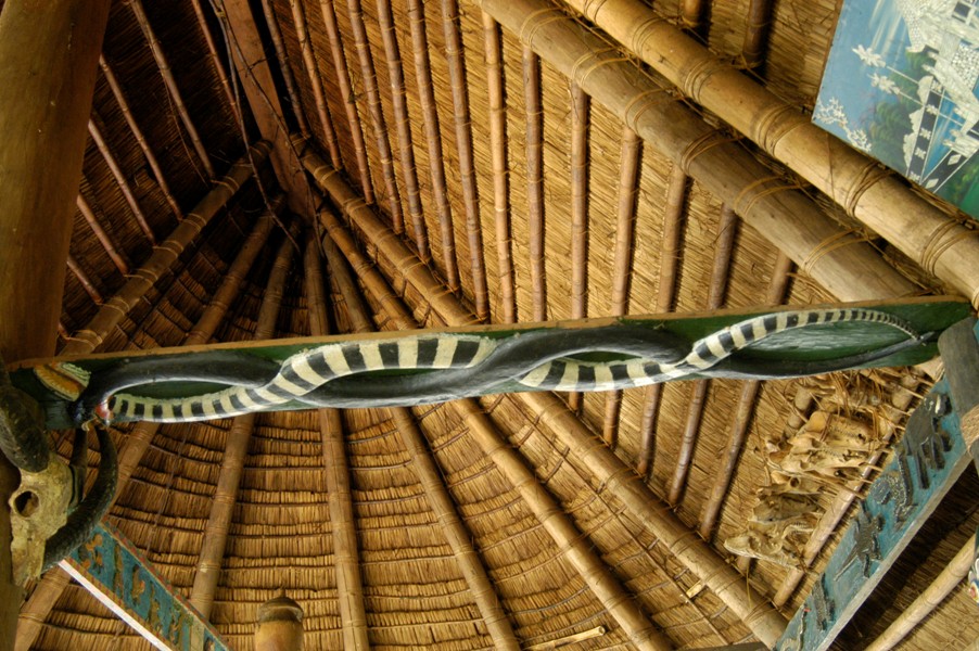 | Nhà Gươl của người Katu trang trí bằng xác một con rắn độc treo trên nóc nhà. |