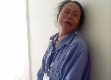 Bà Tuân vật vã với nỗi đâu trong hành lang toà án.