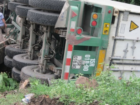 Cua gấp, xe container lật, nằm 'chềnh ềnh' dưới kênh thoát nước