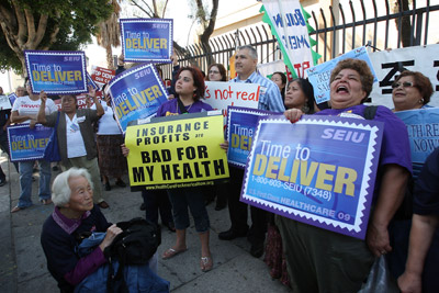 Công nhân y tế khởi đầu chiến dịch thực hiện 100,000 cuộc gọi cho Quốc Hội, vào hôm 20 Tháng Mười, thúc giục các nhà làm luật thông qua luật cải tổ y tế để mọi người Mỹ đều có đủ sức mua bảo hiểm. (Hình: David McNew/Getty Images)