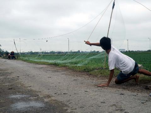 Tôi để ý quan sát, trên con đường thẳng tắp chạy ngang qua giữa cánh đồng lạc của xã Diễn Thành, chúng tôi đếm được không dưới 10 tốp đang giăng bẫy đánh bắt chim én. Mỗi nhóm đều giăng một tấm lưới thưa dài chừng 5-6 m, rộng 2-3m, đủ để lũ én sau khi sập bẫy không thể thoát ra.