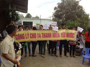 Các thanh niên với biểu ngữ “Công lý cho 14 Thanh niên yêu nước”. Hình chụp sáng 23.5.2013 cách Tòa án Nghệ An khoảng 8km, nơi diễn ra phiên phúc thẩm các thanh niên công giáo./Photo courtesy of VRNs