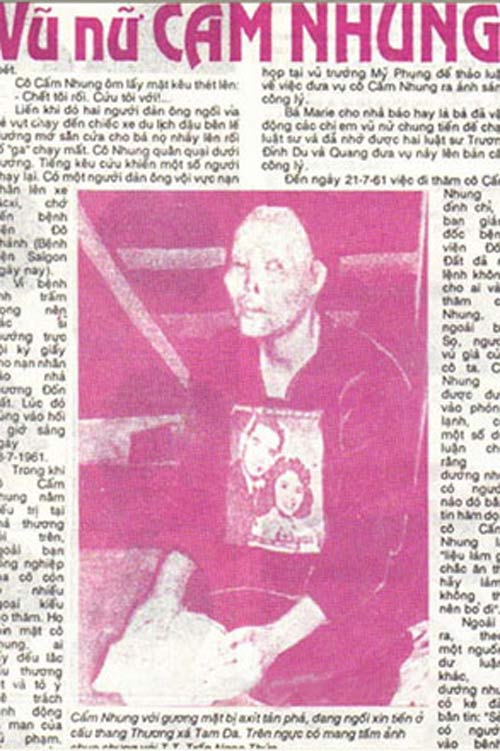 Vụ tạt axit rùng rợn đã biến cô vũ nữ giàu có, đẹp lộng lẫy thành cô gái mù lòa xấu xí, phải đi ăn mày. Khi còn là vũ nữ, Cẩm Nhung nổi tiếng nhất Sài Gòn, lúc đi ăn mày cô càng “nổi tiếng” hơn, khi luôn đeo trước ngực bức ảnh mình chụp với người tình trung tá thời trên đỉnh cao danh vọng.
