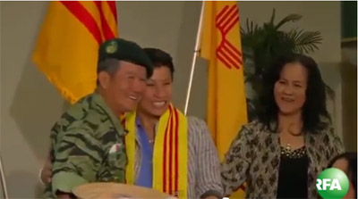 Cuộc gặp gỡ đầy xúc động giữa thiếu úy Trần Khắc Báo (trái) và cô Trần Thị Ngọc Bích-Kimberly Mitchell (giữa) vào ngày 29 Tháng Ba. (H́nh: Chụp từ website của RFA)