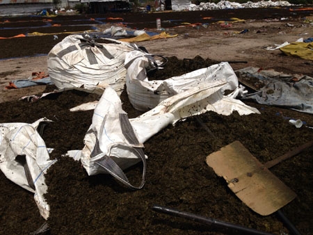 Bãi đất trống rộng bên hông nghĩa trang trong khu phố Bình Đức thuộc UBND phường Bình Hòa, huyện Thuận An, tỉnh Bình Dương được ông Hoàng (A Tỷ) làm bãi tập kết phơi bã trà phế thải trước khi đưa vào hệ thống lò sấy trà theo công nghệ đốt nóng bằng củi than. Mới đi từ ngoài vào bãi phơi bã trà, chúng tôi giật mình bởi mùi hôi thối như phân trâu xốc lên mũi. Giữa trưa hừng hực nắng, gần 20 công nhân lực lưỡng đang dùng cào phơi rơm, cuốc để banh từng bao bã trà ra phơi nắng. Bã trà để ẩm ướt lâu nên bốc mùi khó ngửi.