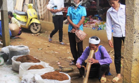 Thuốc lào ở đây không có gì khác biệt nếu không nói là chất lượng kém hơn. Chúng được đựng trong những chiếc thúng to, không chia ra các gói nhỏ trong túi nylon, cũng không ép thành bánh hình chữ nhật. Điều làm cho mấy gian hàng thuốc lào đó trở nên “tiếng tăm” chính là có một số phụ nữ người Mường túm tụm xung quanh, khoan khoái châm lửa rít thuốc. Họ vê thuốc mồi lửa cho nhau, chuyện trò rôm rả. Số phụ nữ hút thuốc đa số ngoài 40 tuổi.