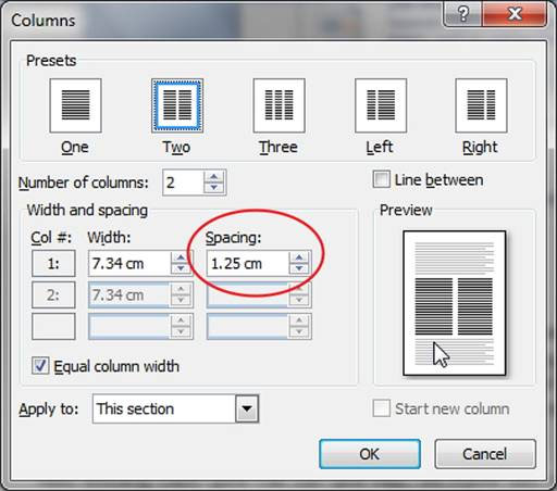 Để điều chỉnh khoảng cách giữa các cột cho thích hợp, bạn có thể chọn More Columns từ thanh đổ xuống Columns (trên thẻ Page Layout). Đối với Word 2003, chọn Columns từ thực đơn Format. Sau đó điều chỉnh khoảng cách giữa các cột tại mục Spacing.