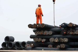 Công nhân Trung Quốc vận chuyển thép tại một bến tàu ở Thanh Đảo, tỉnh Sơn Đông, phía đông Trung Quốc hôm 15/6/2013.