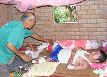 Đó là hoàn cảnh của gia đình ông Lữ Văn Bình (53 tuổi) ngụ ấp 1, xã Xuân Tây, Cẩm Mỹ, Đồng Nai. Để níu kéo sự sống cho con trai út đang mang bệnh xuất huyết tiểu cầu là Lữ Văn Triệu (24 tuổi), hàng ngày ông Bình phải tự tay làm vệ sinh vết thương cho con, thậm chí tự làm phẫu thuật, cắt bỏ từng mảnh thịt thối trên cơ thể Triệu.