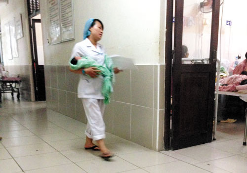 Ở khu A2 BV Phụ sản Hà Nội pḥng chật chội, không có máy điều ḥa nên ngột ngạt. Chị Hồng Nhung (quê Thanh Hóa) kể, hầu như ai vào đây sinh con đều chuẩn bị sẵn “tiền lẻ”. Thường th́ nhân viên y tế sẽ kéo xe đến trước cửa pḥng và gọi các mẹ bế con ra xe để đi tắm, hoặc đi từng giường đón bé ra xe. Mỗi xe khoảng năm đến bảy cháu tùy từng pḥng. “Tiền lẻ” sẽ được các mẹ, các bà để rất kín đáo trong áo của em bé để khi tắm cởi đồ bé là nhân viên y tế sẽ nh́n thấy. Theo chị Nhung, giờ “giá chung” là từ 30.000-50.000đ, tùy từng gia đ́nh.