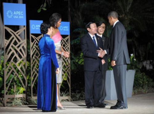 Tổng thống Mỹ Barack Obama cùng phu nhân chào đón Chủ tịch Việt Nam Trương Tấn Sang cùng phu nhân đến dự bữa tối nhân tại Honolulu, Hawaii, vào ngày 12 tháng 11 năm 2011.