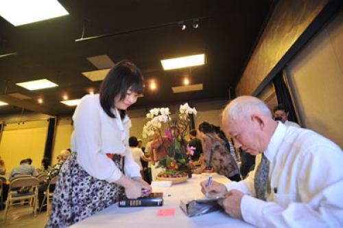 Tác giả Ngô Nhân Dụng ký tặng sách cho một độc giả tại buổi trò chuyện. (Hình: Dân Huỳnh/Người Việt)