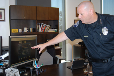 Cảnh Sát Trưởng Kevin Baker chỉ trang web của Sở Cảnh Sát Westminster để người dân báo cáo các trường hợp hối lộ. (H́nh: Linh Nguyễn/Người Việt) |