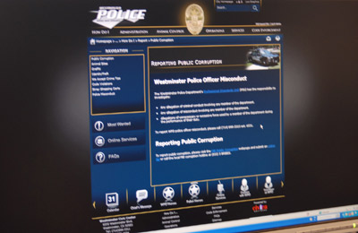 http://www.westminster-ca.gov, nhấn vào chữ “Departments,” rồi nhấn vào chữ “Police,” cư dân sẽ được dẫn sang trang web của sở cảnh sát. Sau đó, vào hàng chữ “How Do I” (trên cùng bên trái), sẽ thấy chữ “Report” (màu vàng) ngay ở dưới. Dưới chữ này là một dăy chữ từ “Public Corruption” cho đến “Police Misconduct.”