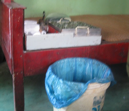 Ngay bên cạnh chiếc giường là một chiếc thùng sơn đen đúa chất đầy giấy vệ sinh lau máu cắt giác cho người bệnh. Trên đầu giường là bình ga lớn và chiếc nồi nấu thuốc. Đây là hình thức chữa bệnh không kém phần "nguyên thủy" của thầy Tám Chừng. Câu chuyện của thầy Tám Chừng và vợ chồng trẻ ngồi bên chúng tôi trở nên nực cười khi thầy nói: "Nếu không có tâm sơn (bộ thờ cúng - PV) thì nấu cháo rồi mua con gà luộc, cúng xong ngồi banh háng ra mà ăn. Nhưng tối không ngủ được thì ráng chịu".