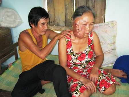 Nh́n khuôn mặt của bà bị khối u xâm chiếm, nhiều người chứng kiến cũng không khỏi xót xa. Khối u bắt đầu phát triển rộng xuống cằm, tai, khóe mắt, cổ… vết này lành th́ vết kia lại bắt đầu bung da, lở loét. Trên khối u là những mụn nhỏ bằng viên bi, bà Đoẻn cho biết, khi những nốt này bị bong th́ chảy máu và có mùi tanh.
