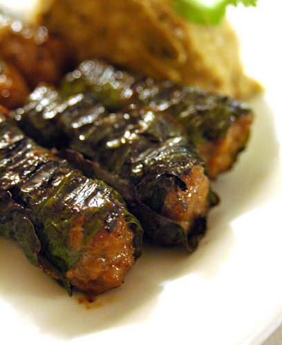 2. Gói thịt: Đặt ngửa, xếp ngang từng 3 lá lốt, nửa lá này xếp chồng lên nửa lá kia , dùng muỗng súp múc một phần thịt đặt vào giữa lá, nắn miếng thịt cho dài đều, lượng thịt lớn hơn ngón tay út người lớn một chút – đừng làm cuốn thịt lớn quá, sẽ cháy lá mà thịt khó chín – gấp hai cạnh lá vào trước rồi cuốn tròn chặt taỵ Làm hết phần lá và thịt.