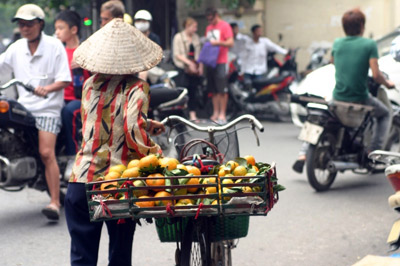 Những xe trái cây nhỏ giữa lòng Hà Nội, cơm áo của những người lao động nghèo. (Hình: Phương Ngạn/Người Việt)
