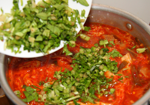 - Kim chi thái khúc vừa ăn cho vào hầm cùng, khi nước sôi nêm lại gia vị cho vừa ăn.