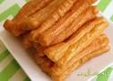 C. Rắc ít bột khô để riêng ra khay để láng khay cho khỏi dính. Lấy khối bột đã ủ ra, nhồi lại rồi cán mỏng ra thành miếng có chiều cao chừng 12cm bề dày chừng non 1cm. (Còn chiều dài miếng bột thì cứ cán ra cho đến khi cắt hết khối bột). Dùng dao xắn từng thỏi dài 12 x 1cm đặt chồng hai thỏi lên nhau rồi dùng dao ấn nhẹ theo chiều dọc cho thỏi trên lún xuống và dính vào thỏi dưới, dùng hai tay nhấc hai đầu thỏi bột, kéo dài ra thành khoảng 15 – 17cm rồi thả vào chảo dầu sôi. Bánh chín sẽ nổi lên và nở xốp, dùng đũa dài trở đều bánh cho đến khi thấy bánh nổi hoàn toàn trên mặt dầu. Vớt bánh ra, để cho ráo dầu trên giấy thấm hoặc vỉ thưa. Bánh chín đạt yêu cầu là ngoài vàng giòn, bên trong mềm sắc trắng, hơi nhẩn dai và có kích thứơc gấp nhiều lần khi chưa chiên, hai thỏi bánh dính hẳn vào nhau nhưng cũng rất dễ rứt ra.