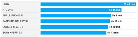 Kết quả cho thấy với thỏi pin có dung lượng 3.000mAh, chiếc smartphone G2 của LG có thời lượng pin sử dụng cao nhất với 6 giờ 48 phút. Xếp thứ 2 trong danh sách là HTC One với thời lượng pin sử dụng 5 giờ 45 phút, mặc dù chiếc smartphone này cũng chỉ được trang bị thỏi pin có dung lượng 2.300mAh tương tự như trên Nexus 5.
