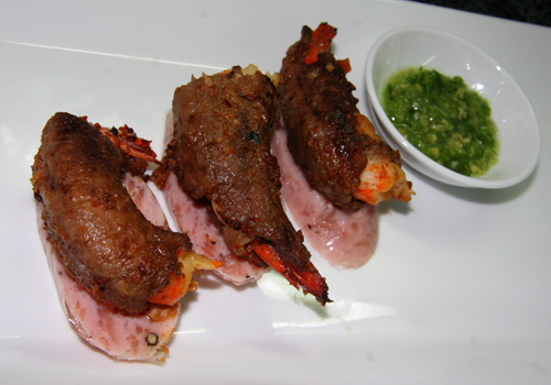 - Chả da thái lát xéo mỏng, kẹp chung với tôm nướng thịt bò, ăn kèm với muối ớt xanh.