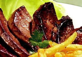 Nguyên liệu - 300 gr Gan lợn - 200 gr Khoai tây - 50 gr bơ -Một thìa cà phê muối - Nửa thìa cà phê tiêu - Xà lách, ngò rí - Muối tiêu chanh - Dầu để rán Thực hiện Gan xắt miếng dày khoảng 0,5 cm, ướp muối, tiêu, đường, tỏi.Khoai tây xắt cọng ránvàng, vớt ra xóc với muối, tiêu vàmột thìa cà phê bơ,đểcho bơ và gia vị áo đều khoai. Đặt chảo lên bếp, chờ chảo nóng, cho khoảng ba thìa canh dầu vào. Cho từng miếng gan vào, áp chảo cho gan vàng cạnh.Tiếp tục trở miếng gan, đảo nhanh tay để gan chín đều mà không bị cứng bên trong. Cuối cùng cho một thìa canh bơ vào gan, trộn đều. Cho khoai tây ra dĩa, trút gan ra, xung quanh bày xà lách và ngò rí. Món này ăn nóng, dùng chung với muối tiêu chanh. Có thể dọn trong bữa cơm gia đình hay đầu bữa tiệc sau món khai vị.