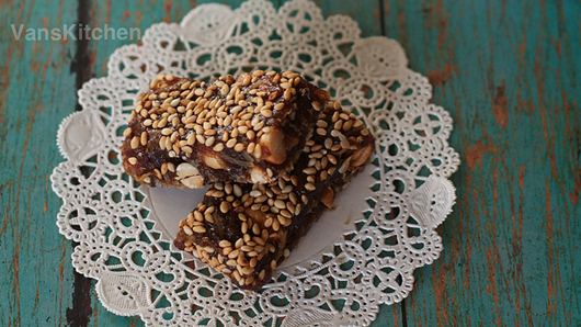 - Rắc 1/2 phần mè lên giấy chống dính. Cho kẹo lên trên. Trải và san bằng. Rắc phần mè còn lại lên trên. Cắt ra thành từng thỏi vừa ăn.
