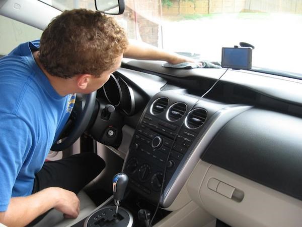 Chú ý: chỉ phun dung dịch rửa kính vào những phần vật liệu plastic, kim loại, thủy tinh không đục lỗ. Những phần vật liệu nào có đục lỗ, chẳng hạn như phần ghế ngồi có lỗ thông hơi phải phun dung dịch vào khăn lau, giấy lau hoặc bàn chải rồi dùng khăn, bàn chải này để chà xát, lau chùi. Sau khi lau cần dùng giẻ khô lau lại rồi dùng máy hút bụi để hút hết dung dịch tẩy rửa nếu không may lọt vào lỗ. Không phun chất tẩy rửa lên các núm vặn hay công tắc, chỉ nên phun dung dịch vào tấm giẻ, sau đó dùng giẻ lau các núm vặn, công tắc để tránh gây hư hỏng các chi tiết này.