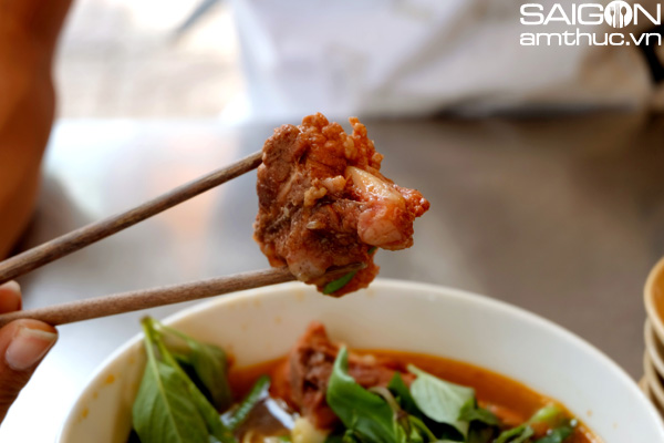 Với món mì sườn kho độc đáo này, điểm nổi bật là phần nước dùng hơi sánh cùng những miếng sườn non được kho mềm và đậm đà. Với món này có lẽ bạn không cần phải nêm nếm gì nhiều bởi tự thân miếng sườn và nước dùng đã đủ độ đậm đà rồi. Một cách ăn khá thú vị, nếu không nói là hiếm thấy ở Sài Gòn.