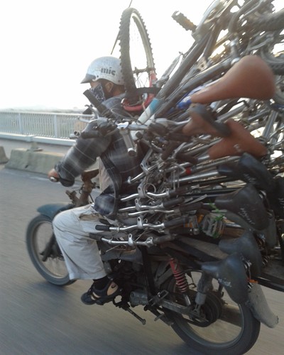 Tôi chụp bức ảnh này đầu tháng 3/2014, tại cầu Bính (TP Hải Phòng). Một nam thanh niên đi chiếc xe Cup, bất chấp luật giao thông khi đèo 9 chiếc xe đạp kiểu dáng thể thao lao băng băng trên cầu.