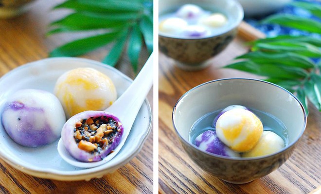 Vị béo ngọt, thơm phức của khoai lang cùng với màu trắng, vàng, tím trộn lẫn vào nhau tạo nên món bánh trôi nước vừa bắt mắt vừa ngon miệng.
