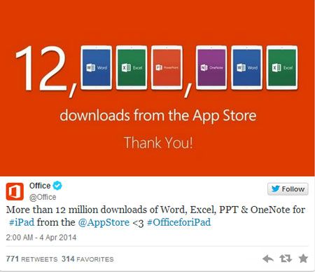 Trên trang Twitter của mình, Microsoft tỏ ra rất vui mừng và tự hào khi công bố một con số ấn tượng sau 1 tuần ra mắt phiên bản Office, “Hơn 12 triệu lượt tải các ứng dụng Word, Excel, PowerPoint, và OneNote dành cho iPad từ App Store”