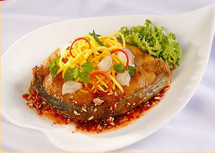 - Xếp cá 1 bên dĩa, gỏi 1 bên dĩa, trang trí ít húng lủi và ớt sừng cắt sợi, đặt chén nước mắm pha kế bên.