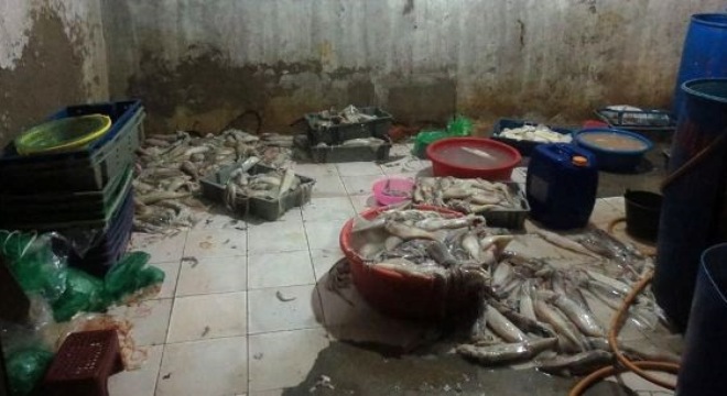 Tiến hành kiểm tra kho, cảnh sát phát hiện có 750kg mực ống đã bốc mùi đang được lưu trữ, trong đó 150kg đang được ngâm tẩm hóa chất.