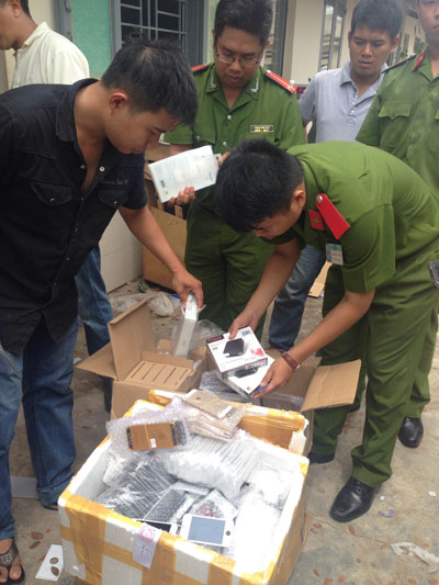 Tại kho hàng ở hẻm 863, trinh sát đã khống chế bắt giữ Trần Ngọc Phú (tức Phú “anh”, 37 tuổi, ngụ quận 7, đang canh giữ hàng) và thu giữ được 15 thùng xốp chứa linh kiện của iPhone, iPad. Cách đó không xa là kho hàng ở hẻm 793 do Lê Quang Vinh (28 tuổi, ngụ quận 7) trông coi, kiểm tra, trinh sát đã thu giữ thêm 122 thùng xốp cũng chứa linh kiện ĐTDĐ tương tự.