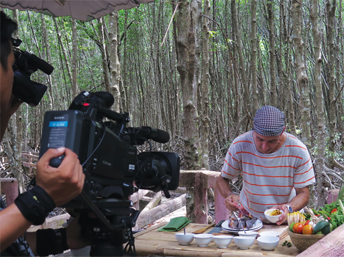Robert Danhi thực hiện món cá thòi lòi nướng xốt mật ong trong rừng đước Cà Mau - Ảnh: N.V