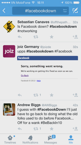 Khoảng 15 giờ chiều ngày hôm nay (19/6), cư dân mạng trên toàn thế giới bỗng nhiên náo loạn vì không thể truy cập vào Facebook. Mặc dù khoảng 30 phút sau thì mạng xã hội này lại trở lại hoạt động bình thường, nhưng 30 phút đình trệ này cũng kịp để lại nhiều "giai thoại", giả thuyết.