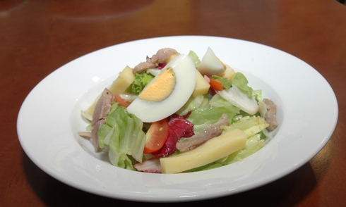 Trứng luộc chín cắt làm 4. Thịt nguội, phô mai cắt que cỡ đầu đũa. Salad các loại cắt miếng vừa ăn. Cà chua bi cắt dọc làm 4, trái ôliu cắt đôi. Trộn giấm và dầu ôliu với mù tạt, nêm lại bằng 1/3 muỗng muối, một muỗng đường cho vừa ăn. Trộn salad, cà chua, ôliu với hỗn hợp dầu giấm. Cho salad đã trộn ra đĩa, xếp thịt nguội, phô mai và trứng lên mặt.