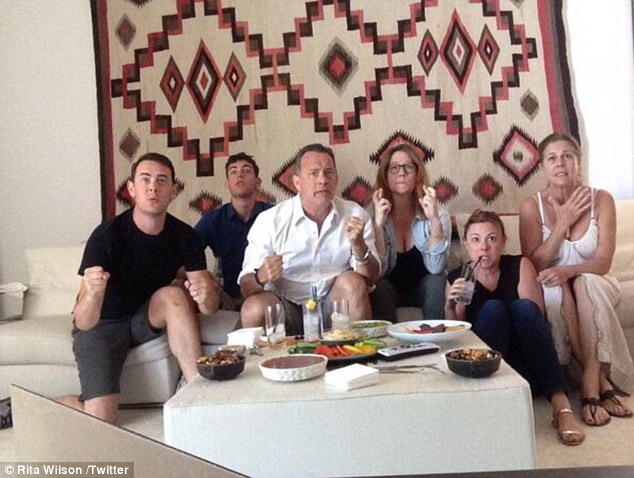 Tom Hanks cùng gia đình chuẩn bị một bữa an thịnh soan trong khi xem trận đấu giữa Mỹ và Bỉ. Vợ anh, Rita Wilson, đưa bức ảnh cả gia đình đang hào hứng theo dõi trận đấu lên trang Twitter.