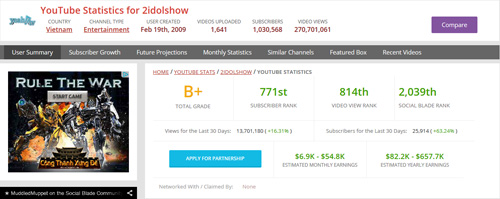 Theo Social Blade, một số channel nổi tiếng ở Việt Nam như sau: