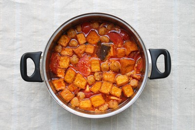 Phi vàng hành tím để riêng. Vớt riêu xong cho màu điều nước, đậu hủ, huyết, bò viên, cà chua vào đun sôi.