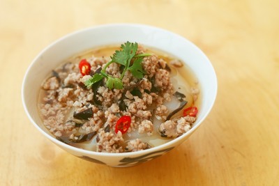 Cho bánh đúc nóng ra bát, thêm thịt băm và nước mắm vào ăn cùng. Có thể cho thêm một ít ớt vào để tăng vị cay tùy khẩu vị.