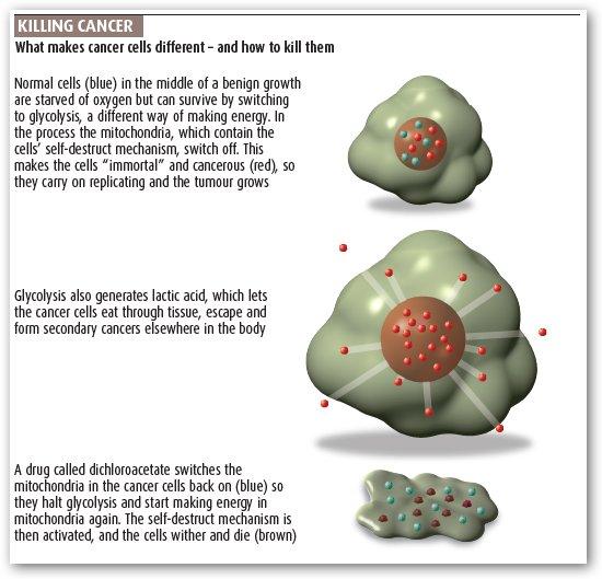 Các nhà khoa học Canada đã kiểm nghiệm dichloroacetate trên các tế bào người. Kết quả cho thấy, thuốc này có thể tiêu diệt được các tế bào ung thư phổi, tuyến vú và não mà không hề động chạm đến các tế bào khoẻ mạnh.