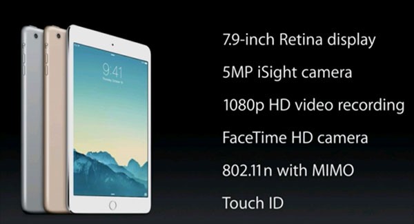"Đề cập lại" cấu hình của iPad Mini 3, máy sở hữu màn hình LCD 7,9 inch, độ phân giải 2048 x 1536, 326ppi, tấm nền IPS, CPU Apple A7. Máy có camera chính 5MP, cho khả năng quay video 1080p, hỗ trợ WiFi 802.11n MIMO cho tốc độ kết nối nhanh hơn nhiều lần, camera trước hỗ trợ thực hiện FaceTime HD, máy cũng được trang bị băng tần LTE, và thời lượng hoạt động của pin kéo dài 10 tiếng đồng hồ.